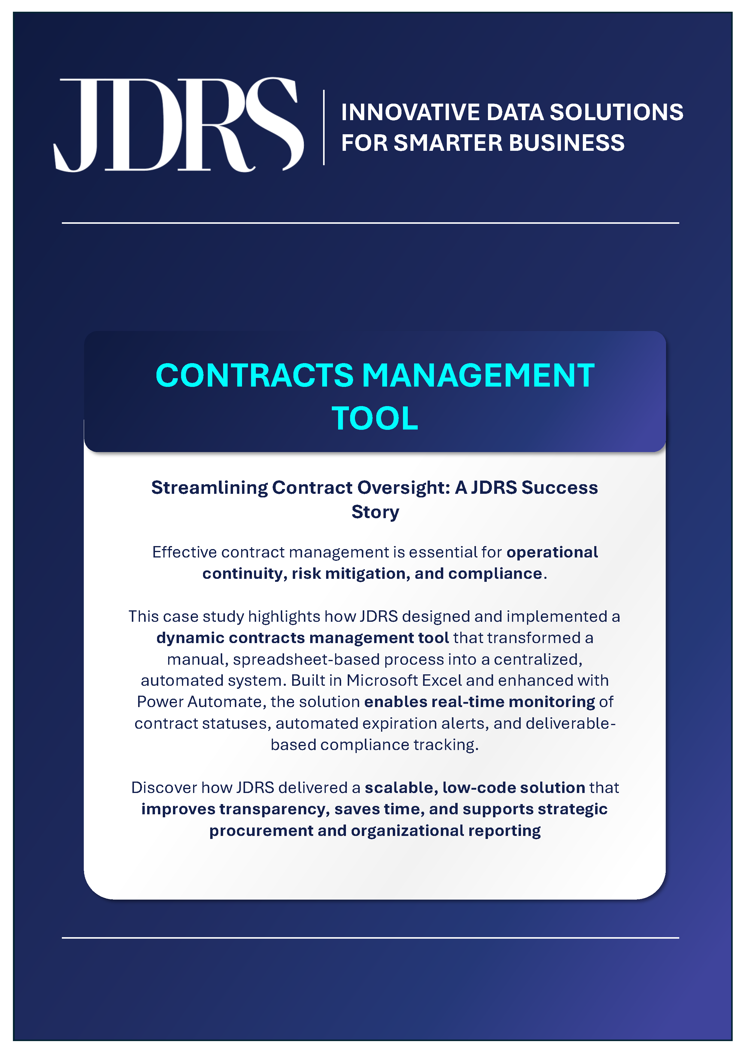 At JDRS, we believe that effective solutions speak for themselves. Our case studies showcase real-world examples of how we’ve transformed complex business challenges into streamlined, data-driven systems. From dynamic sales dashboards to automated invoicing and compliance tools, each project reflects our commitment to precision, innovation, and measurable impact.